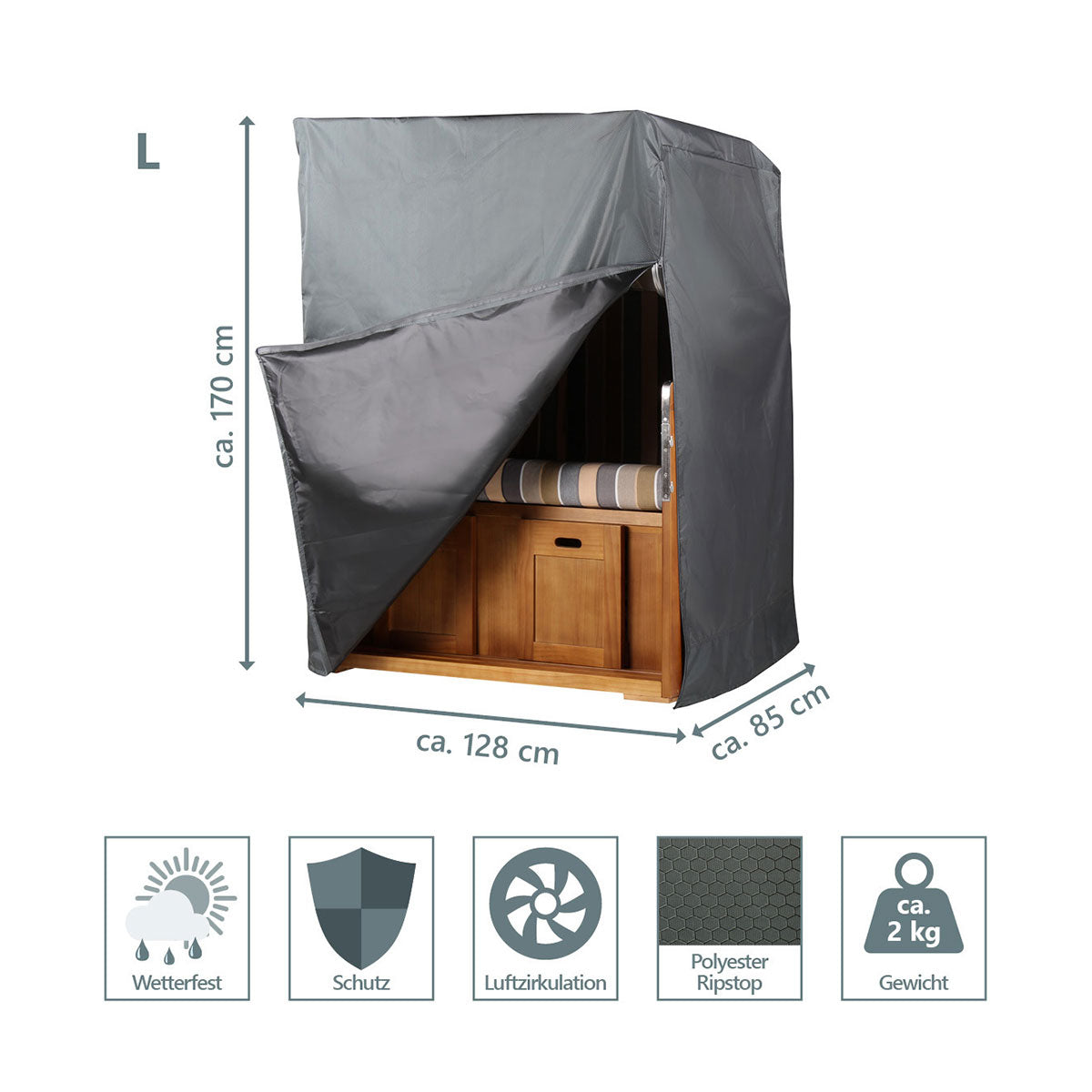 Wenn Sie Ihren Strandkorb nicht nutzen, können Sie diesen strapazierfähigen Schutz einfach überwerfen. Zur Aufbewahrung wird der Hülle eine praktische Tasche beigelegt.