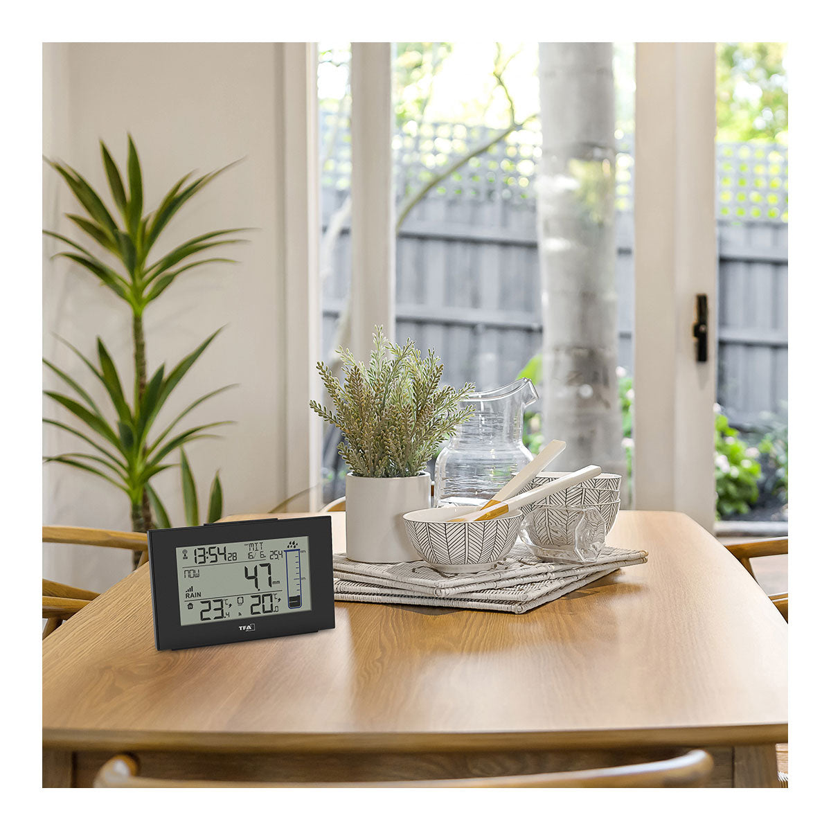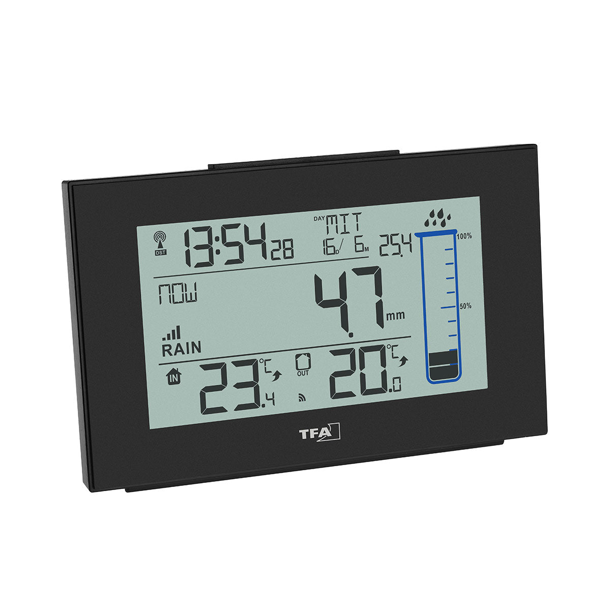 - Kabellose Übertragung der Außentemperatur und Regenmenge (max. 60 m)