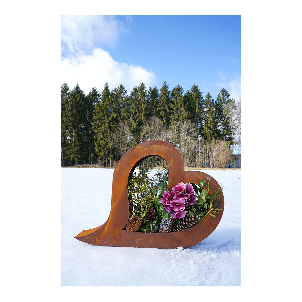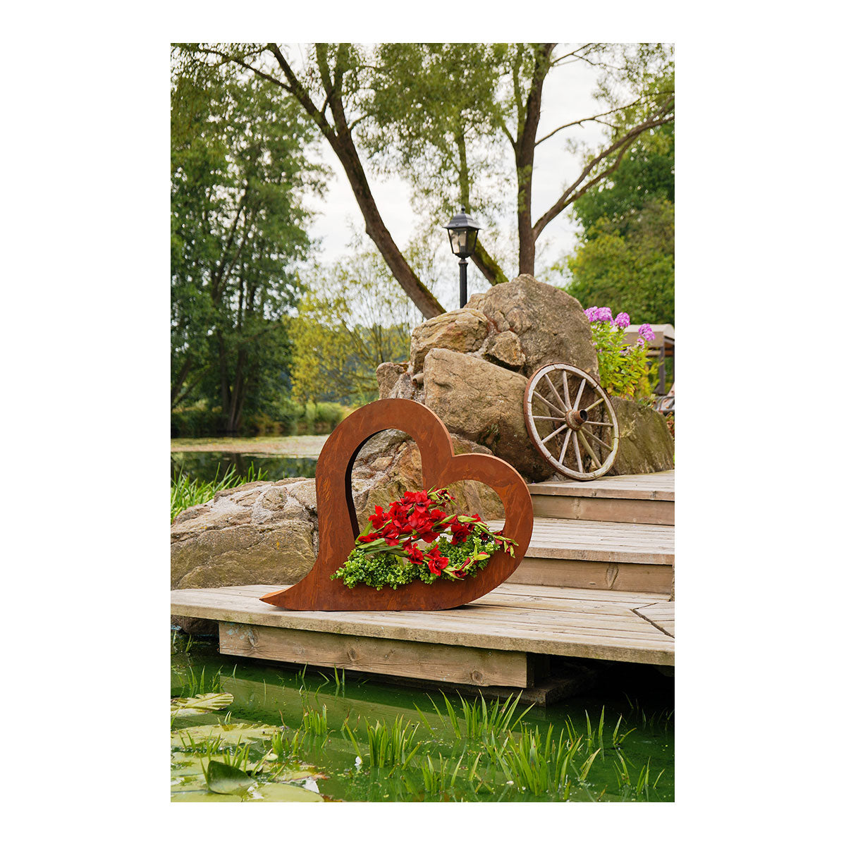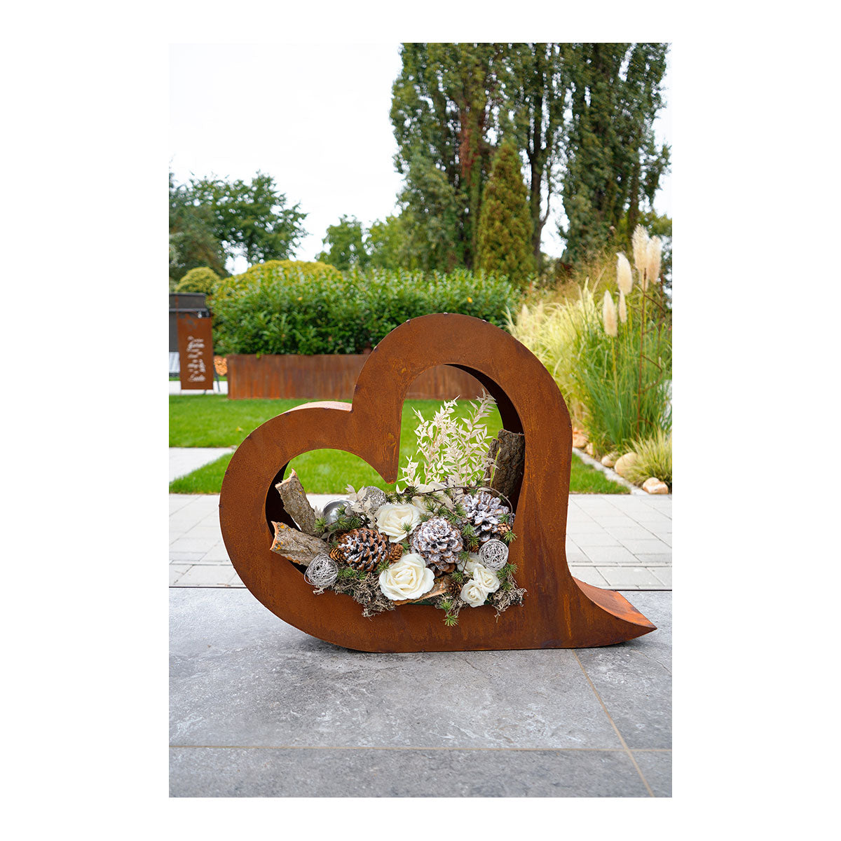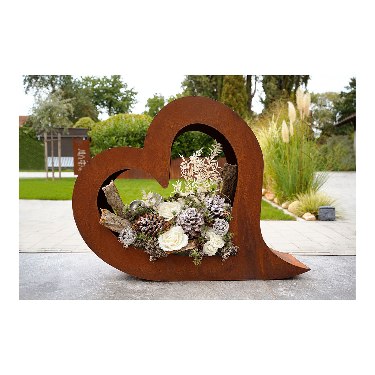 Hinweis: Achten Sie darauf, die Dekoration nicht auf hellen Pflastersteinen zu platzieren, da durch den natürlichen Prozess die Echtrost-Patina abfärben könnte. Ebenso kann es zu Abfärbungen bei Kontakt mit Haut, Textilien etc. kommen.