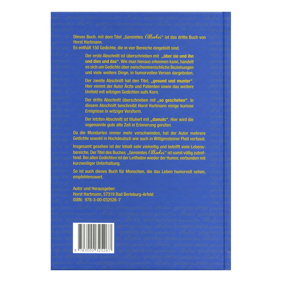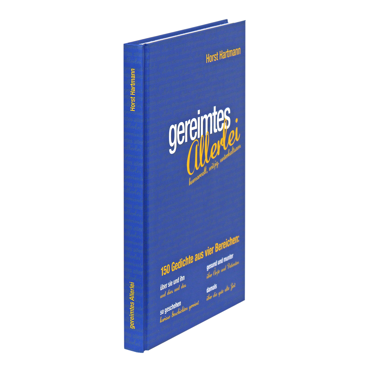Das 3. Buch von Horst Hartmann enthält 150 Gedichte aus vier Lebensbereichen. Leitfaden ist wieder der Humor, verbunden mit kurzweiliger Unterhaltung. Der erste Abschnitt ist überschrieben mit „über sie und ihn und dies und das“. Wie man hieraus erkennen kann, handelt es sich um Gedichte über zwischenmenschliche Beziehungen und viele weitere Dinge, in humorvollen Versen dargeboten. Der zweite Teil hat den Titel „gesund und munter“. Hier nimmt der Autor Ärzte und Patienten sowie das weitere Umfeld mit witzigen Gedichten aufs Korn. Im dritten Abschnitt überschrieben mit „so geschehen“ beschreibt Horst Hartmann einige kuriose Ereignisse in witziger Versform. Schließlich endet das Buch mit dem Bereich „damals“. Hier wird die sogenannte gute alte Zeit in Erinnerung gerufen.