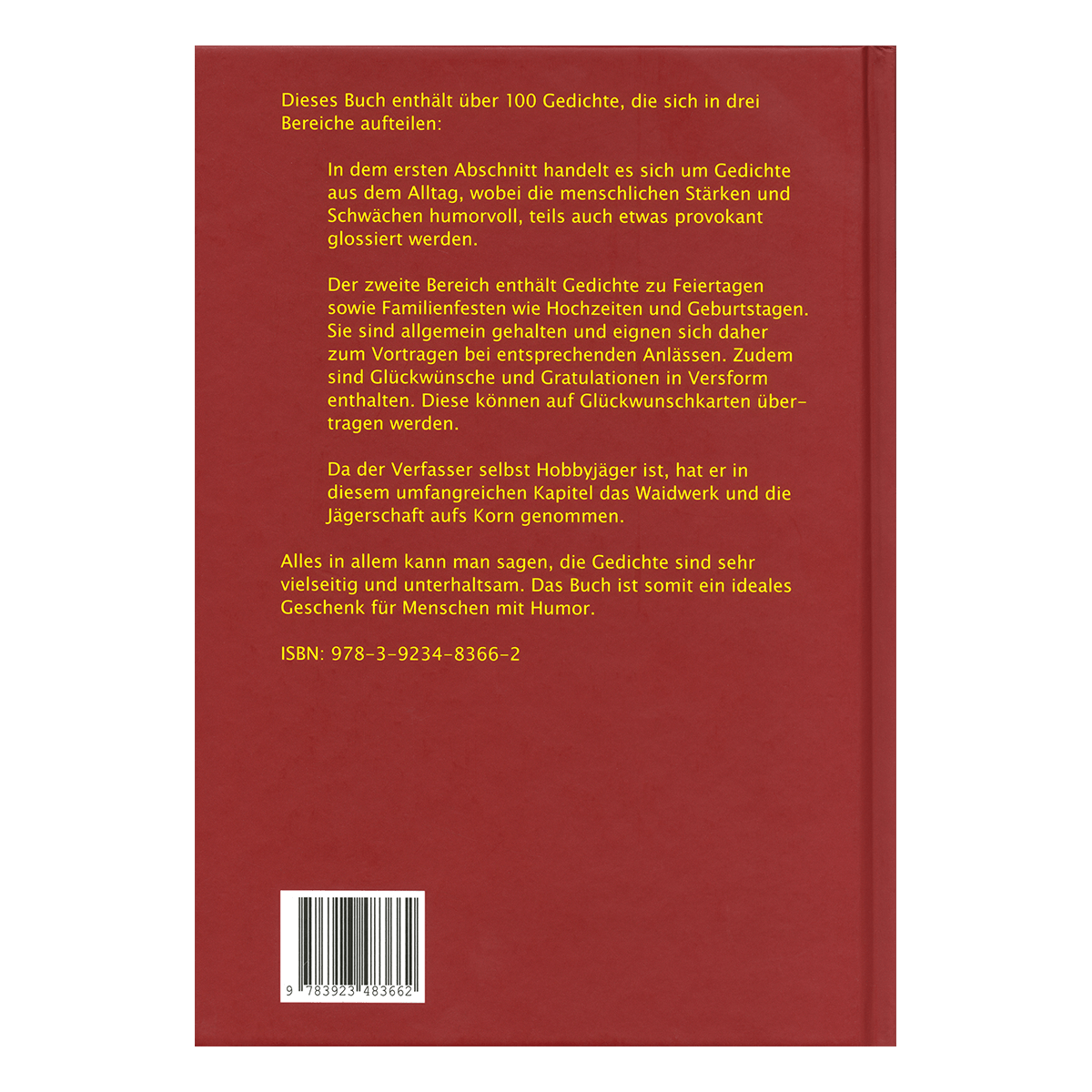 Im ersten Abschnitt handelt es sich um Gedichte aus dem Alltag, wobei die menschlichen Stärken und Schwächen humorvoll, teils auch etwas provokant glossiert werden. Der zweite Bereich enthält Gedichte zu Feiertagen sowie Familienfesten wie Hochzeiten und Geburtstagen. Sie sind allgemein gehalten und eignen sich daher zum Vortragen bei entsprechenden Anlässen. Zudem sind Glückwünsche und Gratulationen in Versform enthalten. Diese können auf Glückwunschkarten übertragen werden. Da der Verfasser selbst Hobbyjäger ist, hat er in diesem umfangreichen Kapitel das Waidwerk und die Jägerschaft aufs Korn genommen. Die Gedichte sind sehr vielseitig und unterhaltsam. Das Buch ist somit ein ideales Geschenk für Menschen mit Humor.