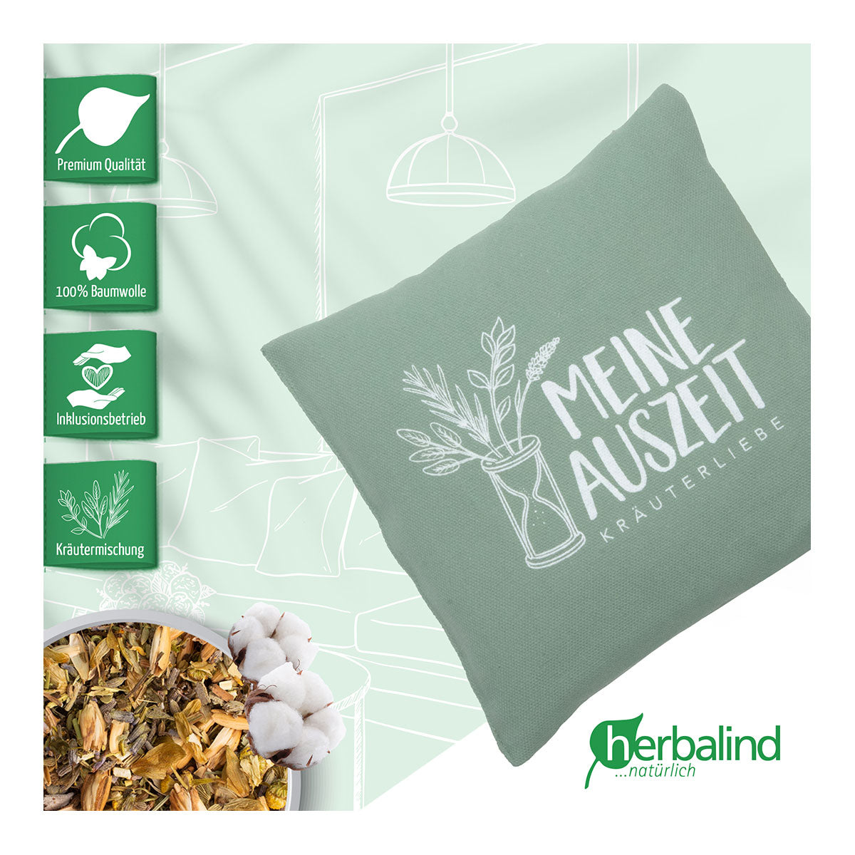 Kräuterkissen „Meine Auszeit“. Holen Sie sich die Kraft der Natur ins Haus. Dieses Entspannungskissen hat einen robusten Baumwoll-Canvas-Bezug, der mit einem Schriftzug bedruckt ist. Seine Kräuterfüllung verbreitet ein aromatisches Dufterlebnis in Ihrem Ambiente.