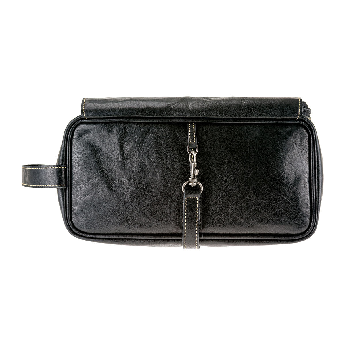 Die Umschlagklappe besitzt einen stabilen Karabinerhaken, der sowohl als Verschluss als auch zum Aufhängen des Kulturbeutels an einem Wandhaken dient.