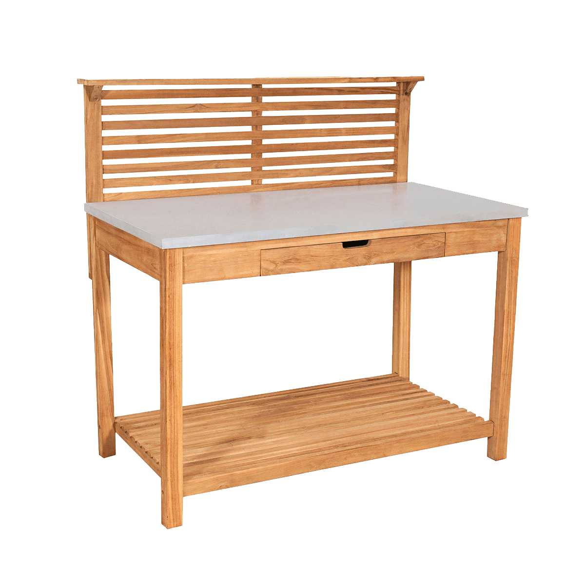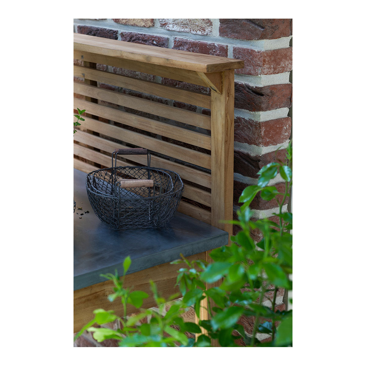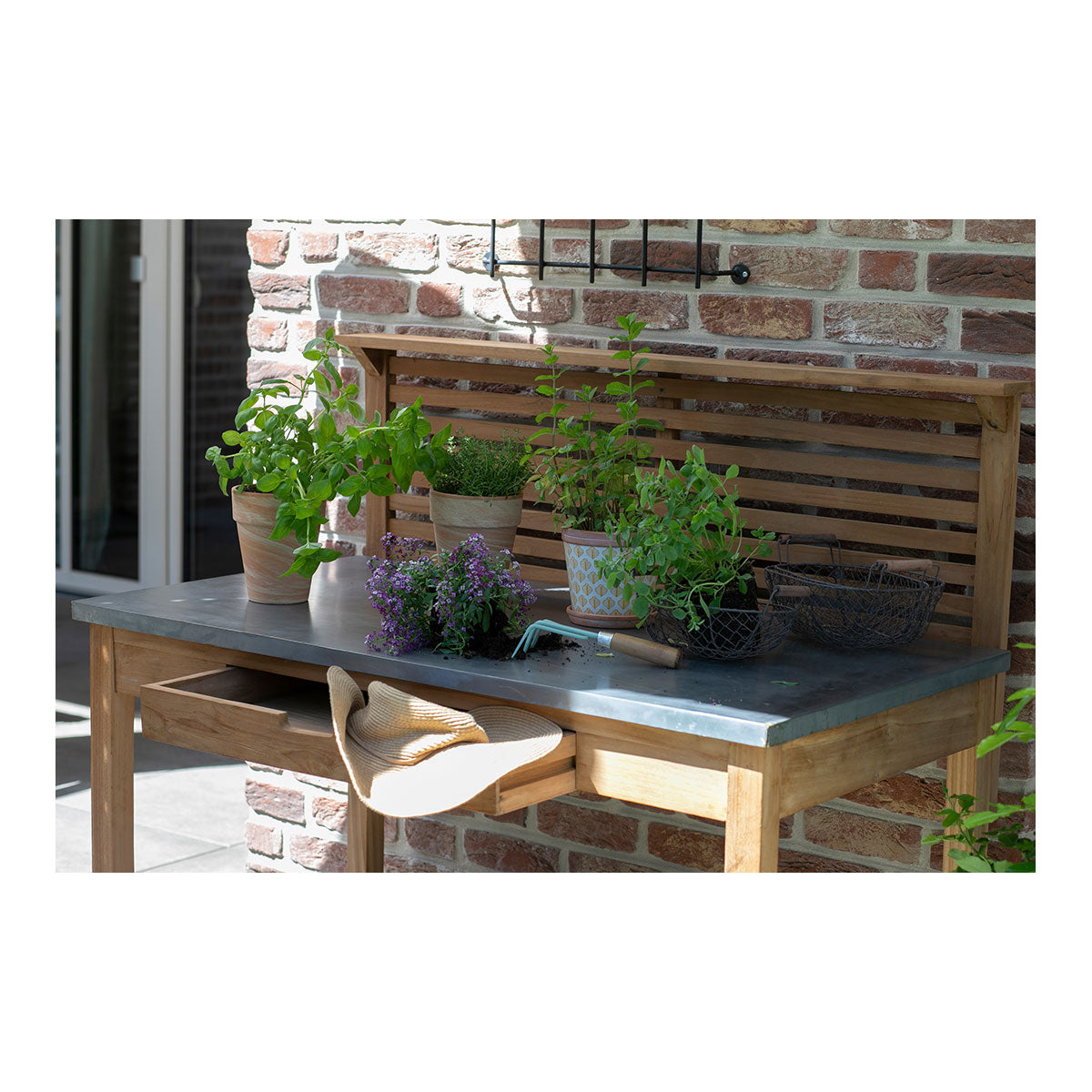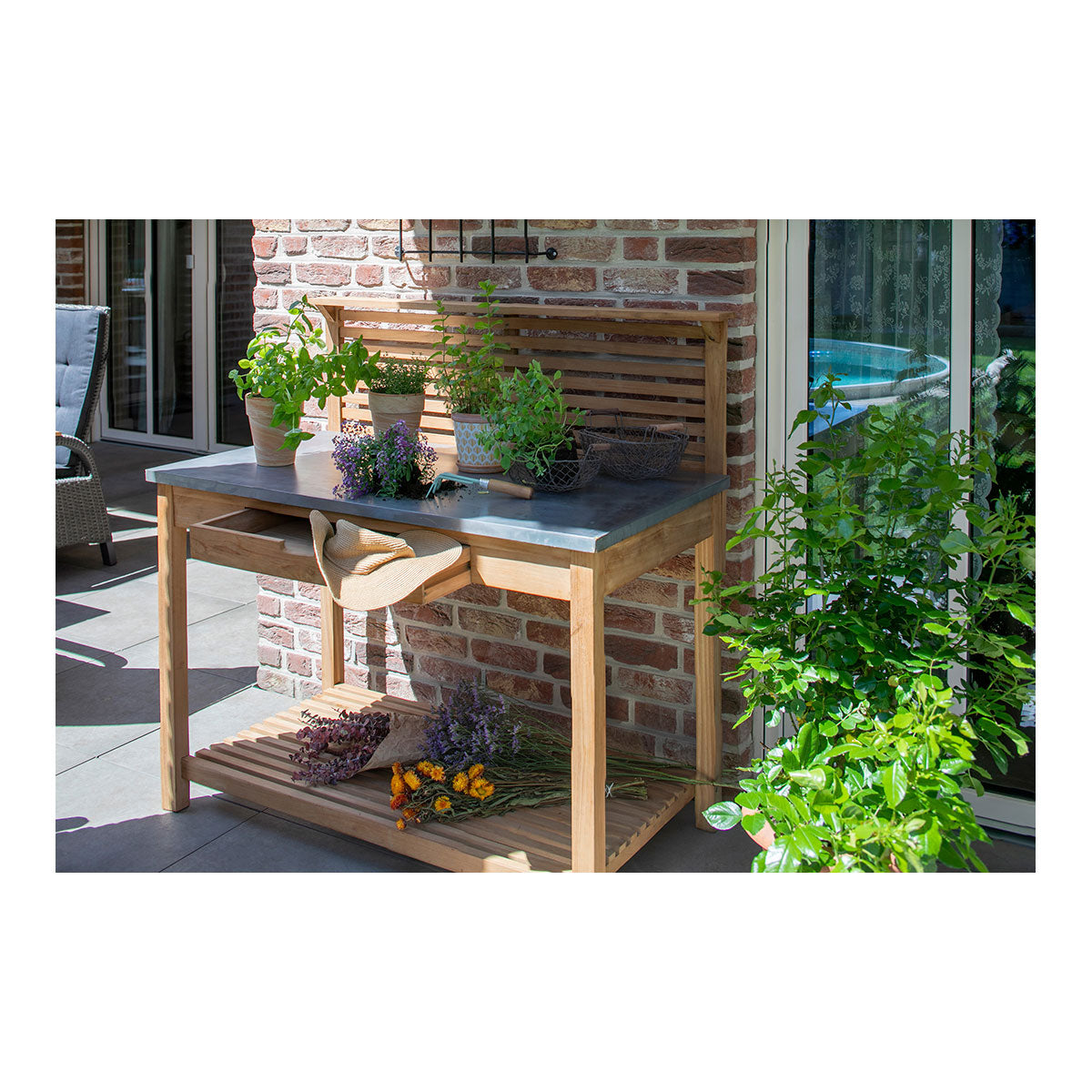 Das exklusive Modell ist besonders sorgfältig hergestellt und besteht aus massivem Teakholz und einer verzinkten Arbeitsfläche. Dies verleiht dem Tisch nicht nur eine pure Eleganz mit rustikalem Charakter – es macht ihn robust und extrem langlebig. Das hervorragende Material lässt sich leicht reinigen und pflegen. Der Tisch ist wunderbar für Garten, Terrasse oder Veranda geeignet. Mit zusätzlichem Stauraum bietet die ausziehbare Schublade viel Platz für Ihre Gartenutensilien!
