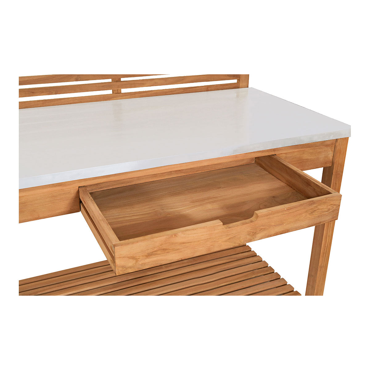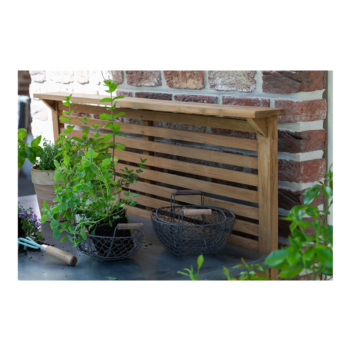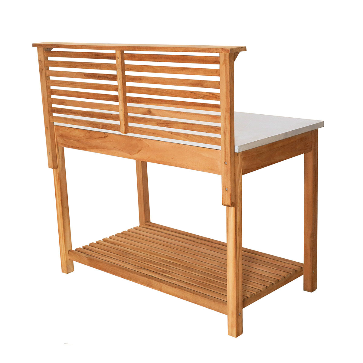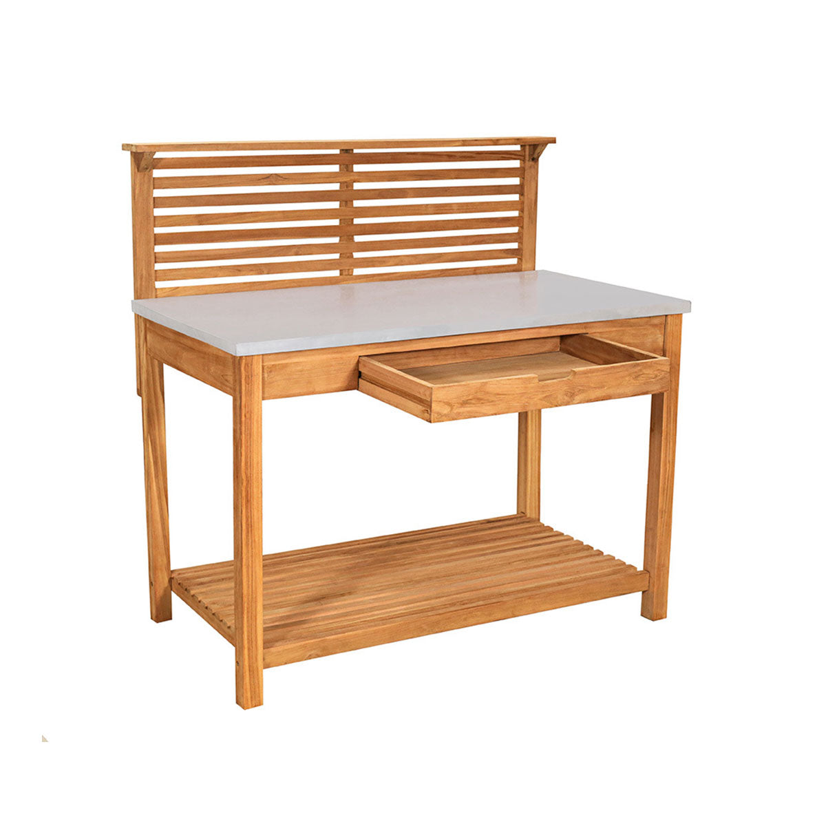 Das exklusive Modell ist besonders sorgfältig hergestellt und besteht aus massivem Teakholz und einer verzinkten Arbeitsfläche. Dies verleiht dem Tisch nicht nur eine pure Eleganz mit rustikalem Charakter – es macht ihn robust und extrem langlebig. Das hervorragende Material lässt sich leicht reinigen und pflegen. Der Tisch ist wunderbar für Garten, Terrasse oder Veranda geeignet. Mit zusätzlichem Stauraum bietet die ausziehbare Schublade viel Platz für Ihre Gartenutensilien!