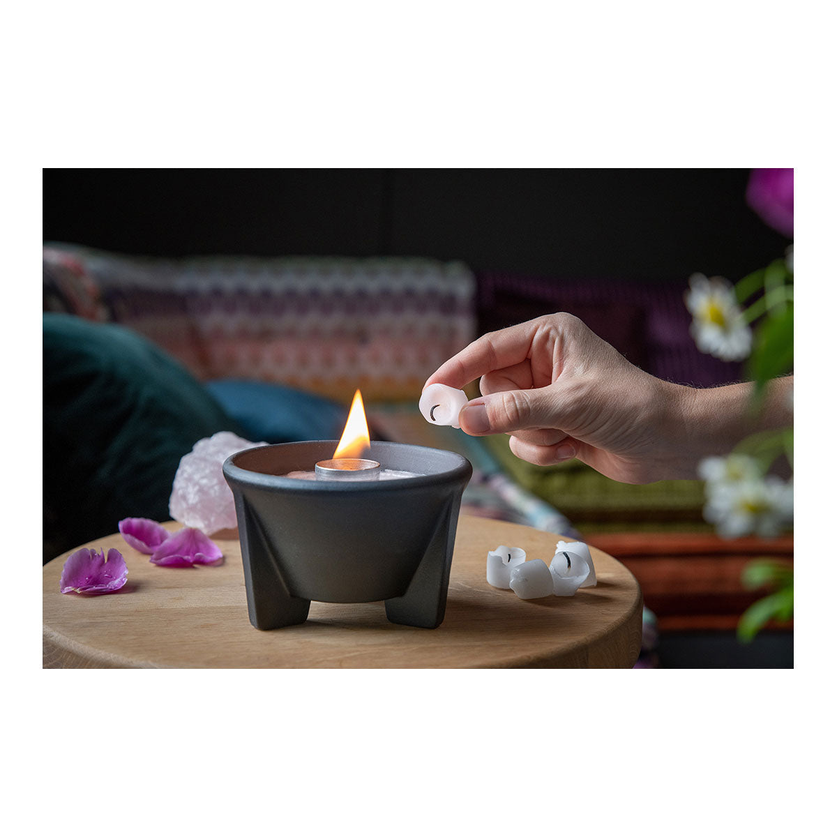 Das Schmelzfeuer wird mit Kerzenresten oder Wachspastillen betrieben. Im Gegensatz zu Petroleum oder Ethanol ist Wachs deutlich sicherer, günstiger und umweltfreundlicher. Das Gerät wird bereits gefüllt geliefert - einfach anzünden und entspannen.
