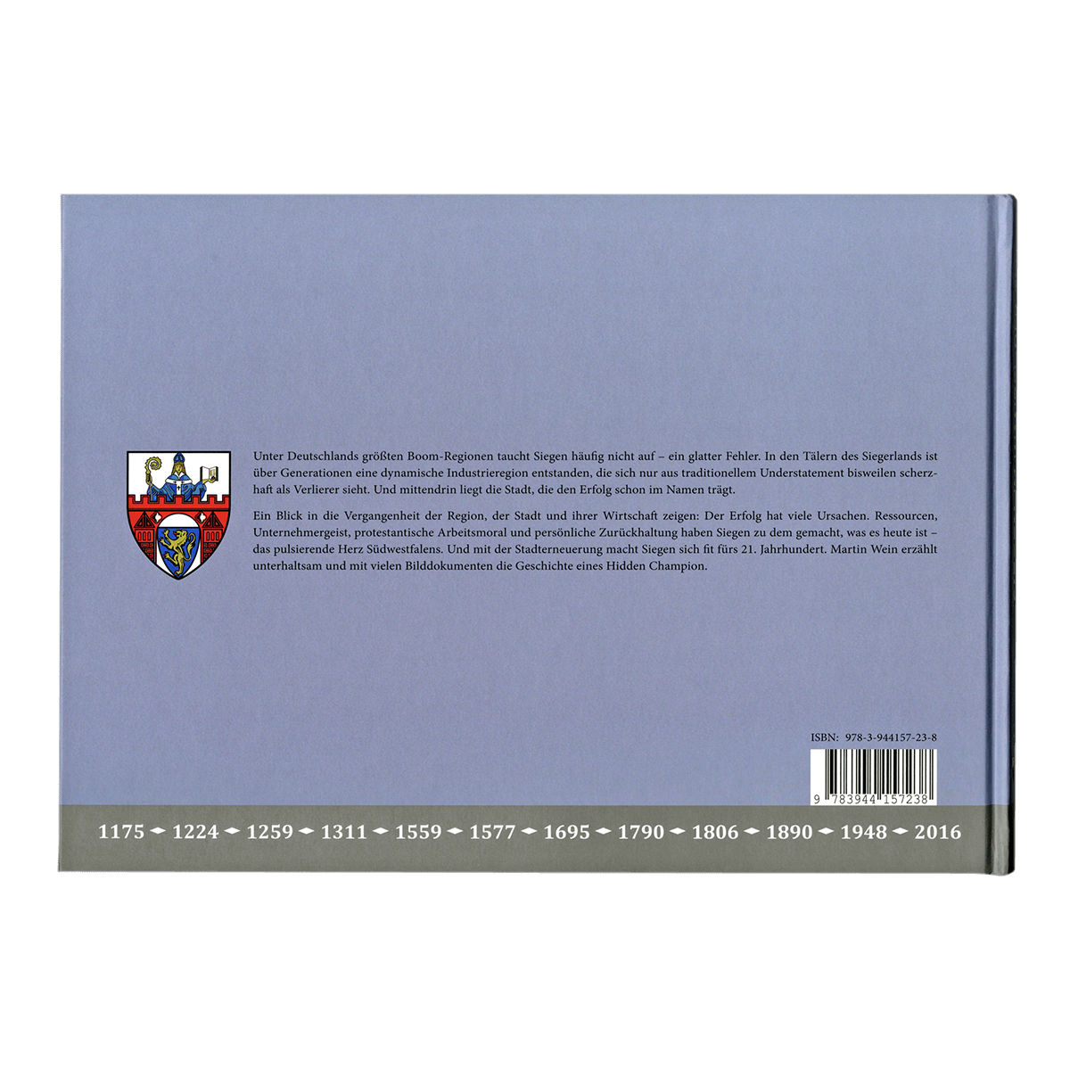 Das Buch des Autoren Dr. Martin Wein, erschienen im Wikomedia-Verlag, München, ist eine Chronik Siegens, die in rund 70 Kapiteln und reich bebildert einen Schwerpunkt auf die Wirtschaftsgeschichte von Stadt und Region legt. Los geht es „500 Jahre vor Christi Geburt mit der Latène-Kultur“ und endet mit dem Stadtumbau 2016. Ergänzt wird die Chronik durch die Porträts vieler namhafter Unternehmen und Institutionen.