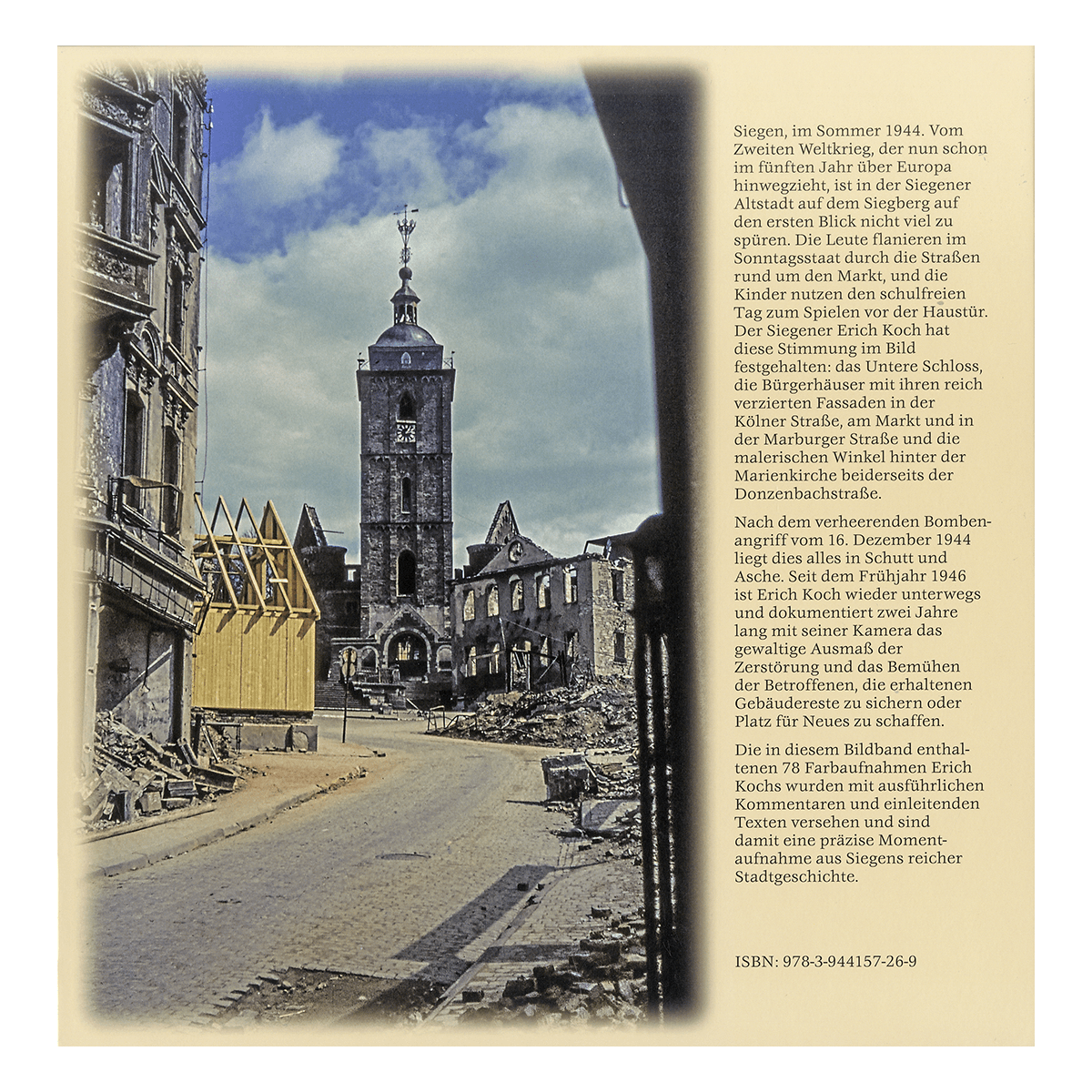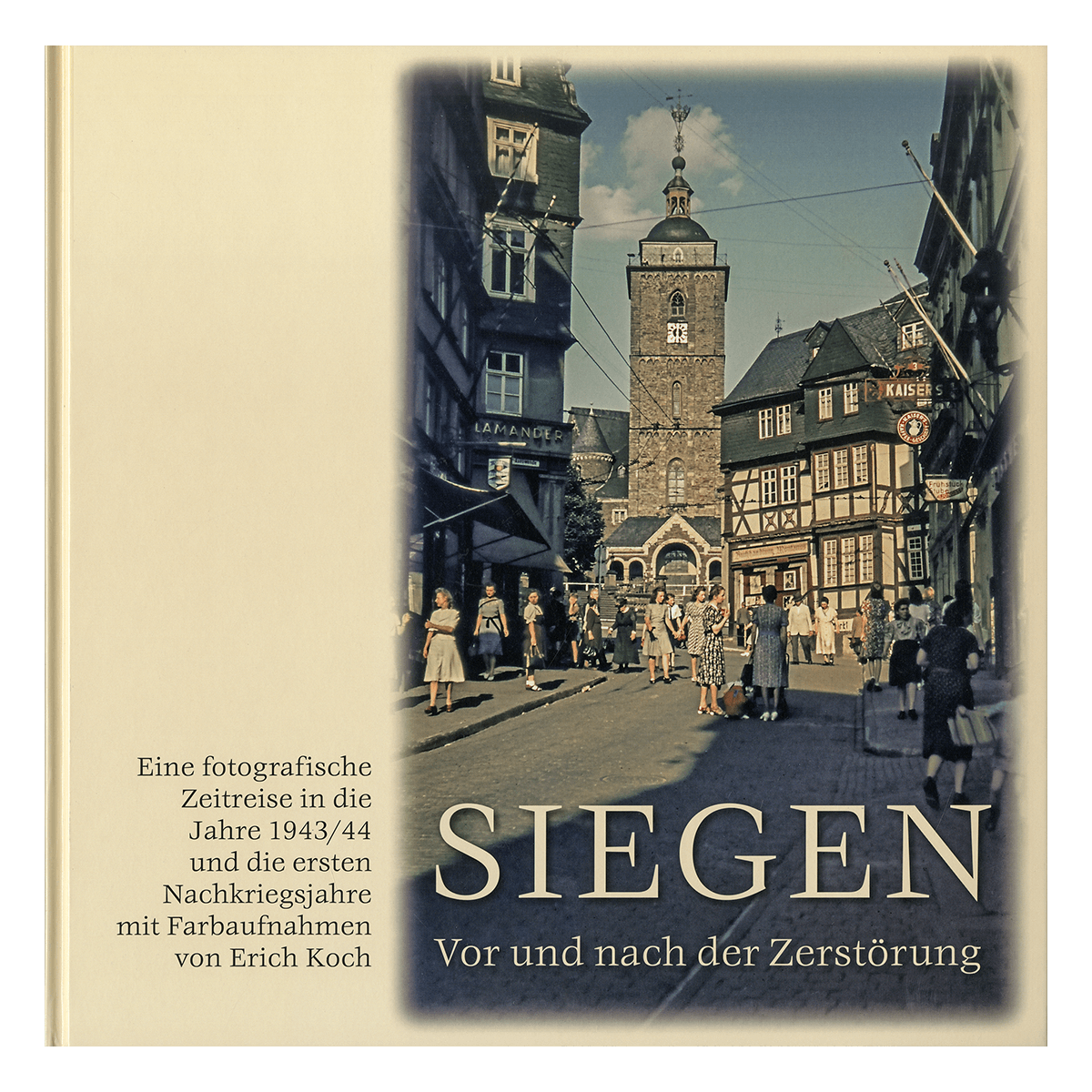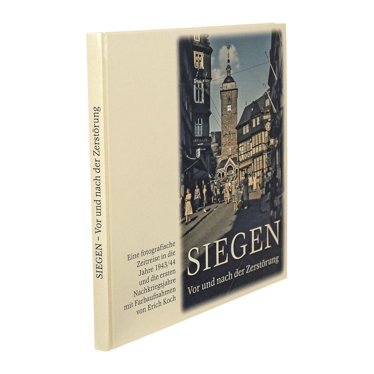 Eine fotografische Zeitreise in die Jahre 1943/44 und die ersten Nachkriegsjahre mit Farbaufnahmen von Erich Koch. Siegen im Sommer 1944. Vom Zweiten Weltkrieg, der nun schon im fünften Jahr über Europa hinwegzieht, ist in der Siegener Altstadt auf dem Siegberg auf den ersten Blick nicht viel zu sehen. Die Leute flanieren im Sonntagsstaat durch die Straßen rund um den Markt, und die Kinder nutzen den schulfreien Tag zum Spielen vor der Haustür. Erich Koch hat diese Stimmung im Bild festgehalten. Seit dem Frühjahr 1946 ist er wieder unterwegs und dokumentiert zwei Jahre lang mit seiner Kamera das gewaltige Ausmaß der Zerstörung nach dem verheerenden Bombenangriff vom 16. Dezember 1944. Die in diesem Bildband enthaltenen 78 Farbaufnahmen wurden mit ausführlichen Kommentaren und einleitenden Texten versehen und sind damit eine präzise Momentaufnahme aus Siegens reicher Stadtgeschichte.