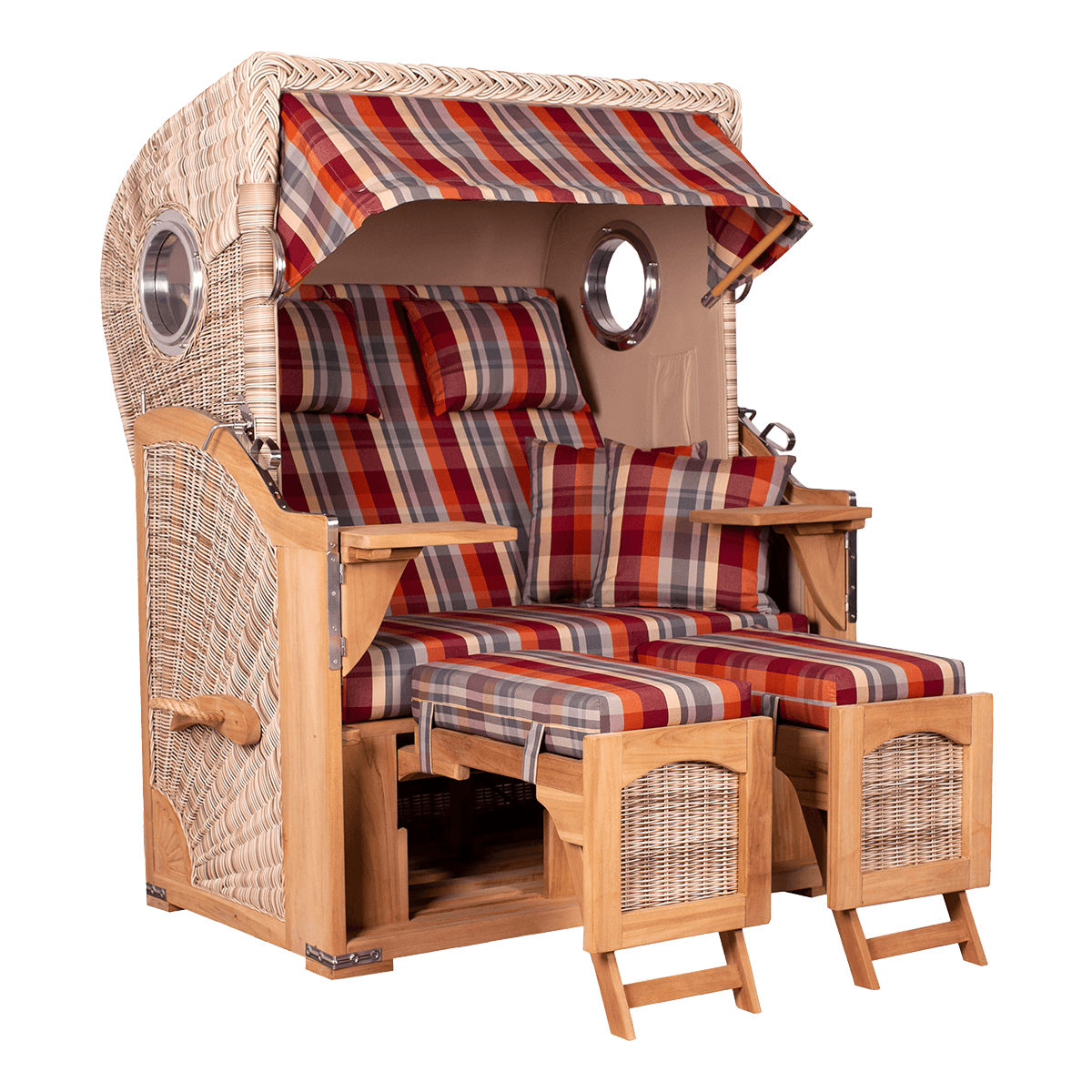 Dank der aufwendigen Verarbeitung von langlebigem Teak, robustem Polyrattan und Beschlägen aus Edelstahl ist dieser Zweisitzer nicht nur besonders hochwertig, sondern auch optimal UV- und witterungsbeständig. Gleichzeitig sorgt eine innenliegende Windschutzfolie zwischen Korbgeflecht und Innenausschlag dafür, dass weder Schmutz noch Nässe das makellose Erscheinungsbild des Innenraums beeinträchtigen. Auch als Windschutz ist der Korb damit optimal ausgestattet, wenn Sie mal an etwas wechselhaften Frühlings- und Sommertagen gemütlich unter freiem Himmel entspannen möchten. Die Ausstattung dieses Premium-Modells umfasst die komplette Kissenausstattung und neben zwei Schwenktischen auch zwei Zeitungstaschen sowie ausziehbare Fußstützen. Dieser luxuriöse Strandkorb bietet Ihnen ausreichend Platz für Getränke und Snacks, Lesematerialien und andere Utensilien - damit Sie sich in Ihre Ruheinsel zurückziehen und den hektischen Alltag für einige Stunden hinter sich lassen können.