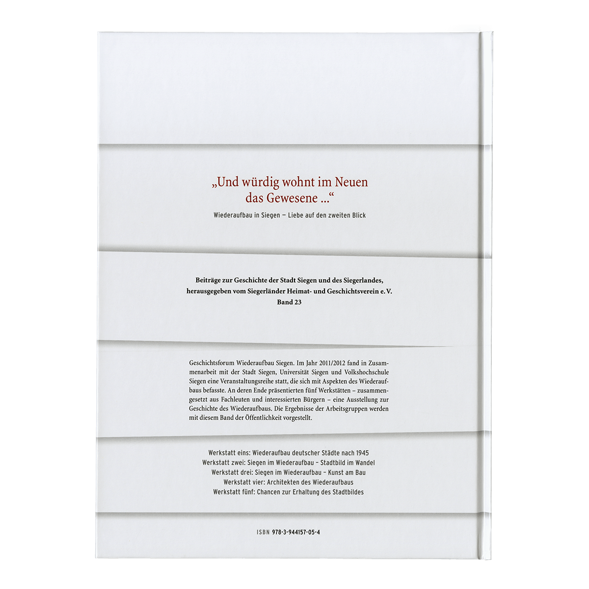 Im Jahr 2011/2012 fand in Zusammenarbeit von der Stadt Siegen, Universität Siegen und Volkshochschule Siegen eine Veranstaltungsreihe statt, die sich mit Aspekten des Wiederaufbaus befasste. An deren Ende präsentieren fünf Werkstätten – zusammengesetzt aus Fachleuten und interessierten Bürgern – eine Ausstellung zur Geschichte des Wiederaufbaus. Die Ergebnisse der Arbeitsgruppen werden mit diesem Band der Öffentlichkeit vorgestellt. Werkstatt eins: Wiederaufbau deutscher Städte nach 1945, Werkstatt zwei: Siegen im Wiederaufbau – Stadtbild im Wandel, Werkstatt drei: Siegen im Wiederaufbau – Kunst am Bau, Werkstatt vier: Architekten des Wiederaufbaus, Werkstatt fünf: Chancen zur Erhaltung des Stadtbildes.