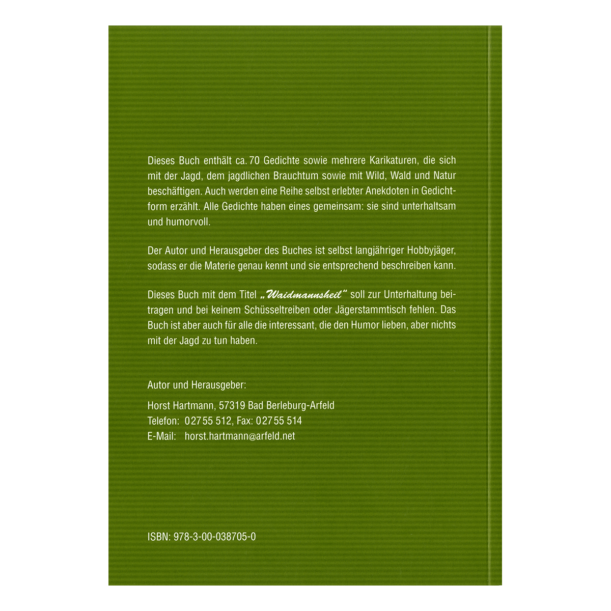 Das 4. Buch von Horst Hartmann enthält ca. 70 Gedichte und mehrere Karikaturen, die sich mit der Jagd, dem jagdlichen Brauchtum sowie mit Wild, Wald und Natur beschäftigen. Es werden auch eine Reihe selbst erlebter Anekdoten in Gedichtform erzählt. Alle Gedichte haben eines gemeinsam: sie sind unterhaltsam und humorvoll. Der Autor und Herausgeber des Buches ist selbst langjähriger Hobbyjäger, sodass er die Materie genau kennt und sie entsprechend beschreiben kann. Aus eigener Erfahrung weiß er auch, dass Jäger neben der Jagd auch die Geselligkeit lieben und zumeist sehr humorvoll sind. Das Buch soll zur Unterhaltung beitragen und bei keinem Schüsseltreiben oder Jägerstammtisch fehlen. Es ist aber auch für alle interessant, die den Humor lieben, aber nichts mit der Jagd zu tun haben.