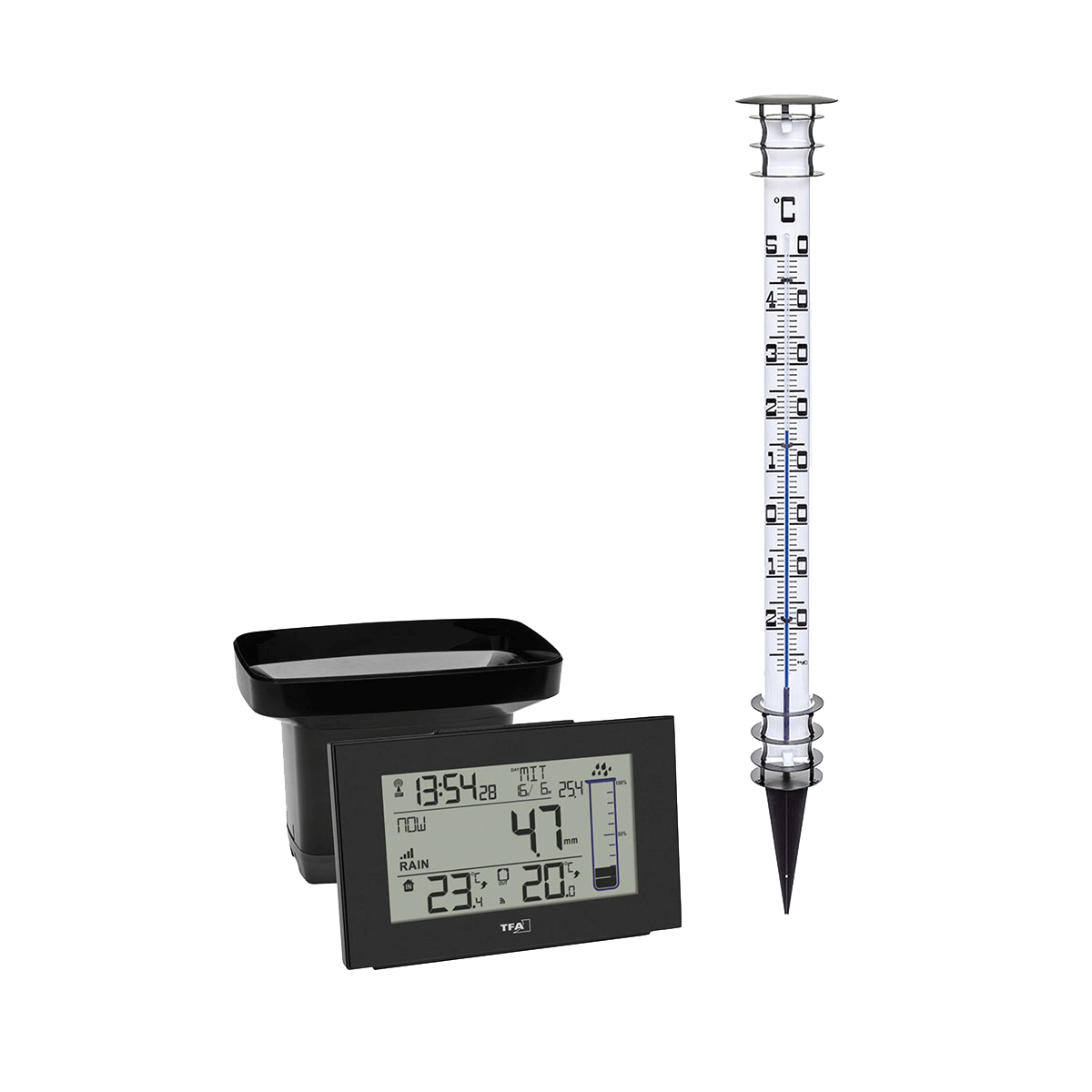 Einfach das Auffanggefäß an einem möglichst freien Platz aufstellen. Außentemperatur und Regenmengen werden kabellos (max. 60 m) auf die Basisstation übertragen. Alle Werte können Sie nun bequem von Ihrem Wohnraum aus mitverfolgen und haben so jederzeit die wichtigsten Daten für Haus und Garten zur Hand. Die grafische Darstellung der Regenmenge ist besonders anschaulich.